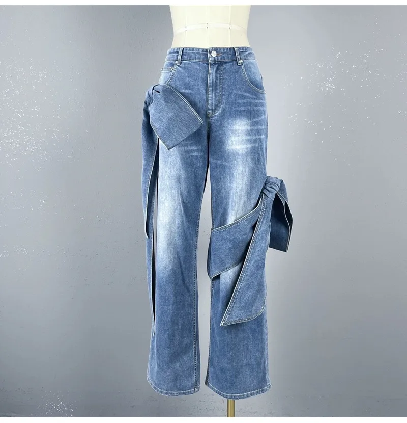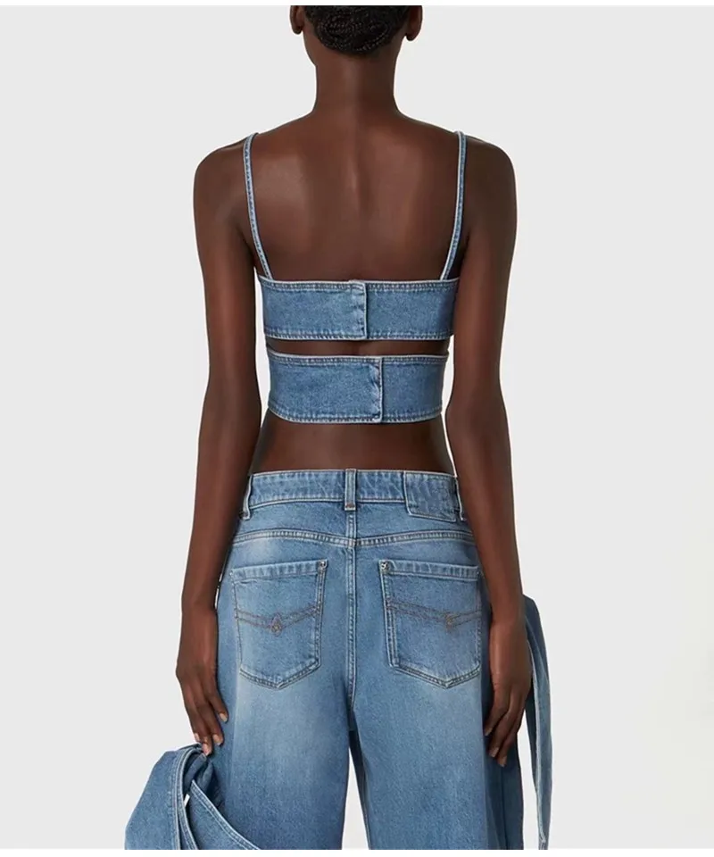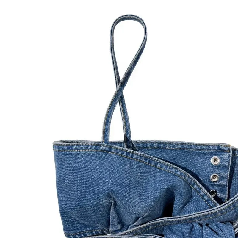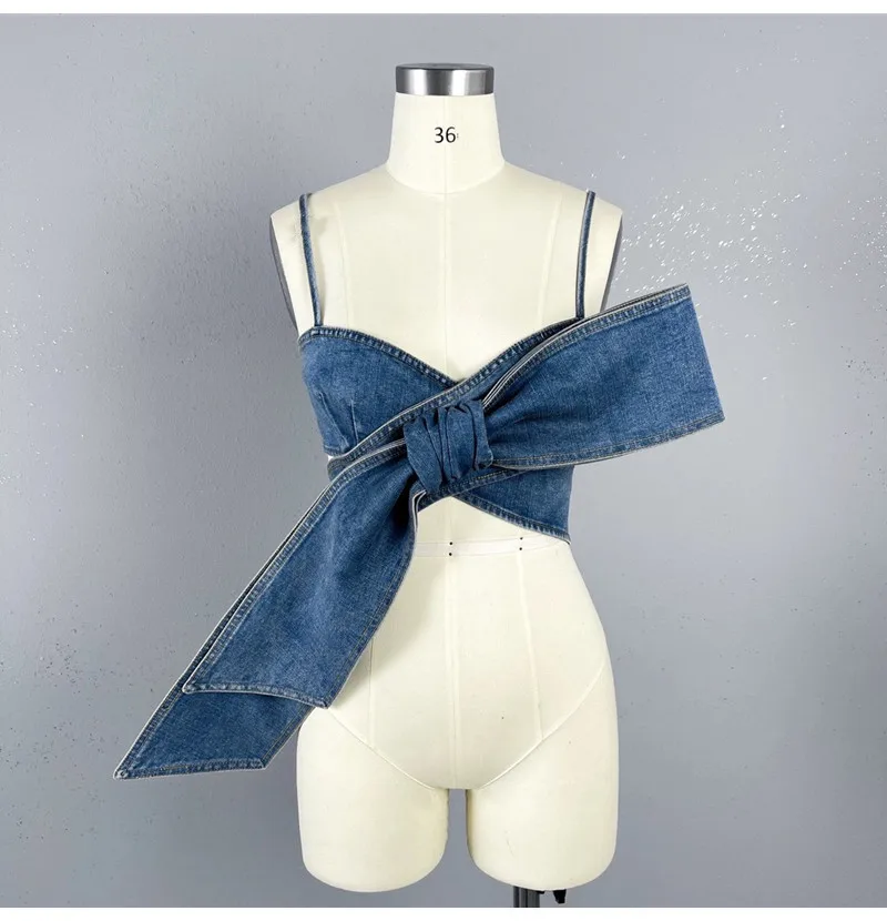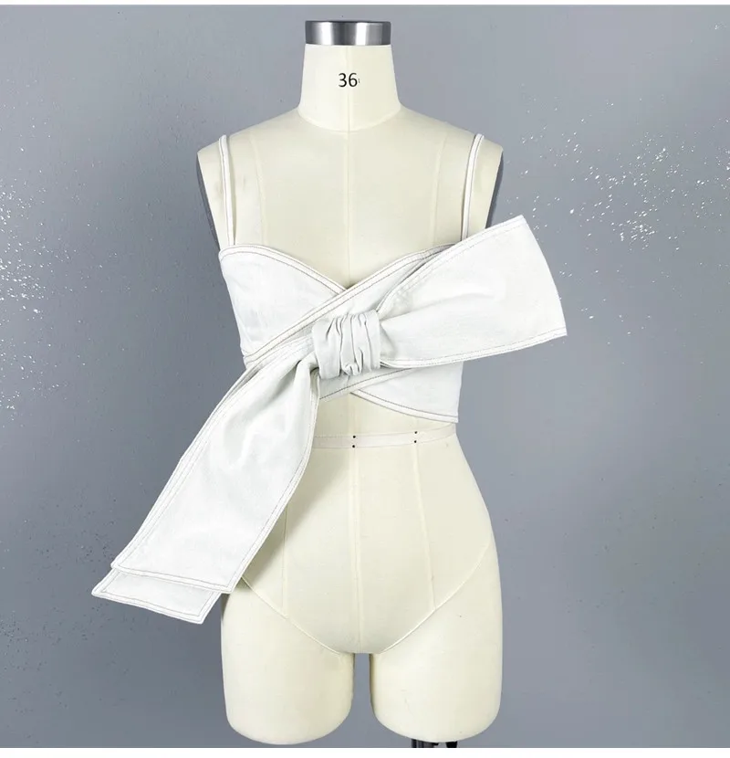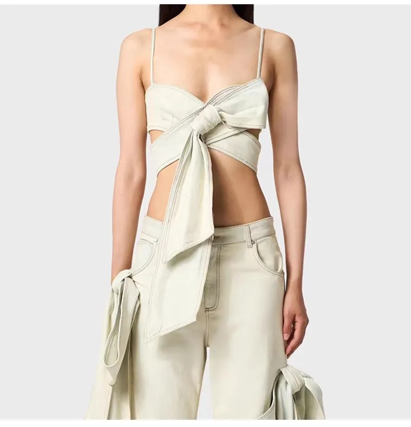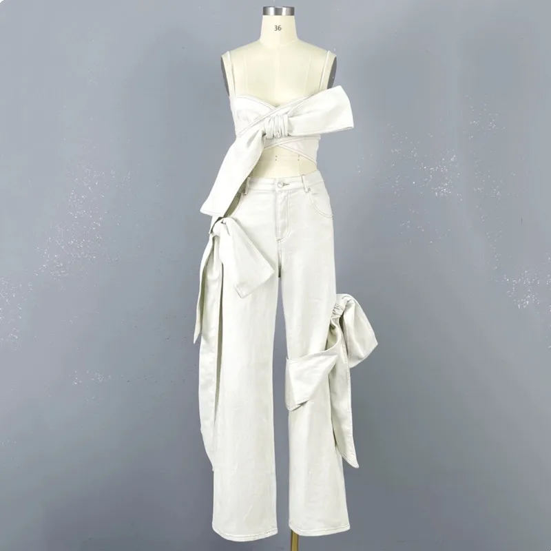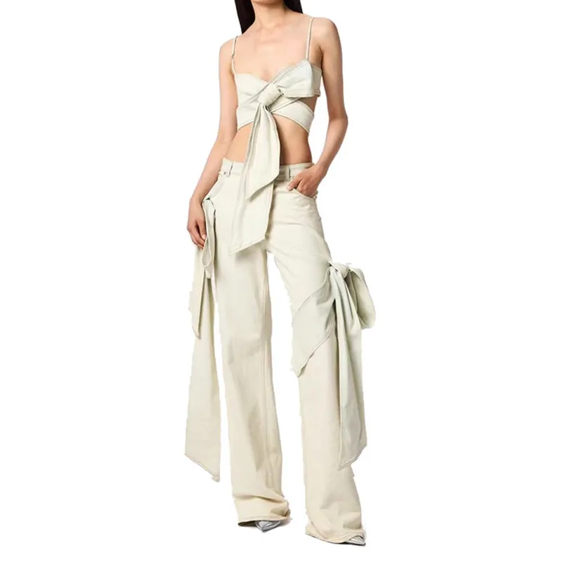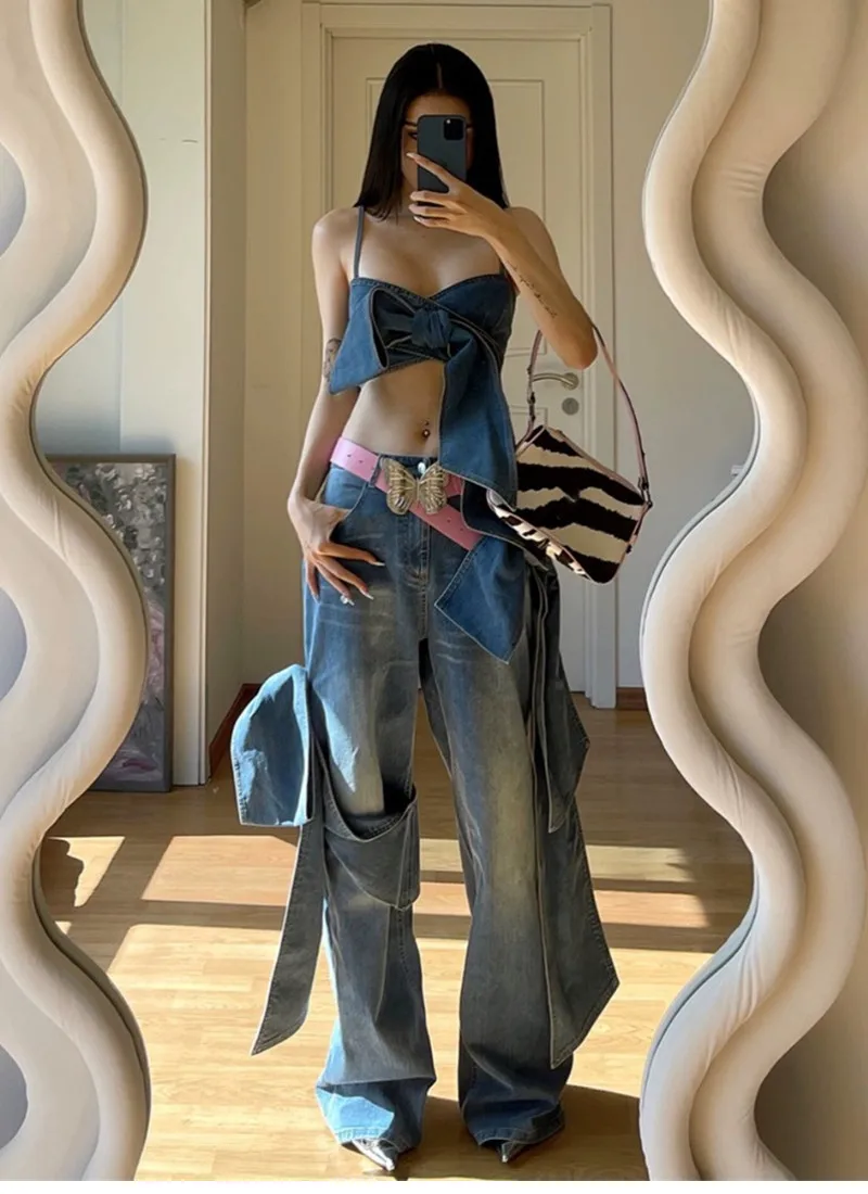 Fashion Women Bowtie Bandage 2 Piece set Denim crop tops Sling Vest High Waist Wide Leg Straight Janes Female Spring New Trendy
