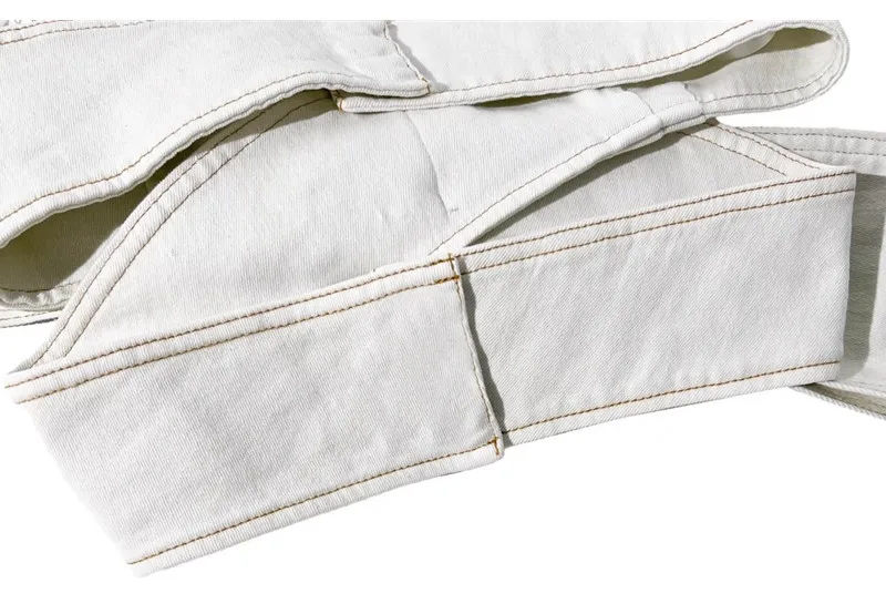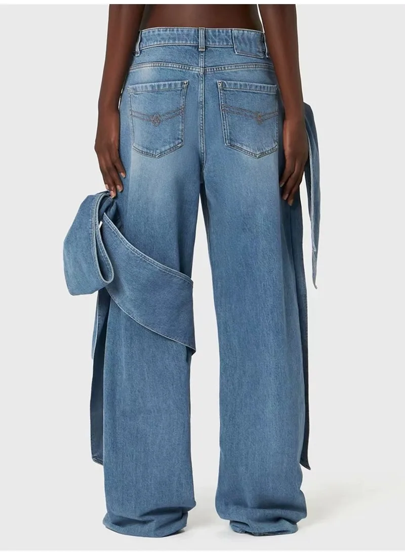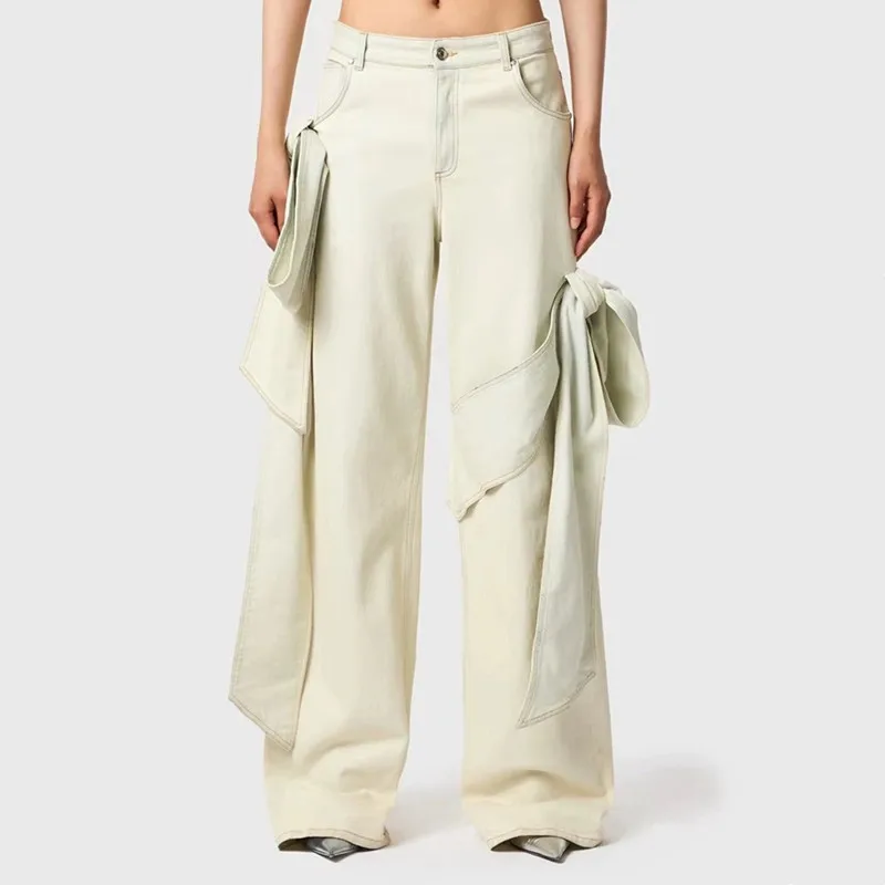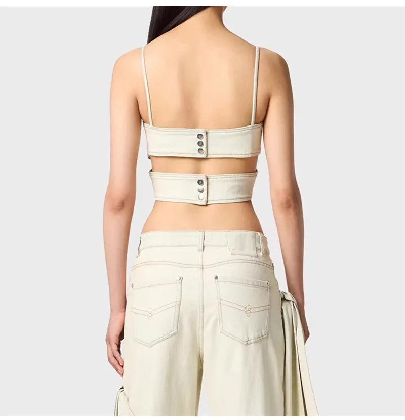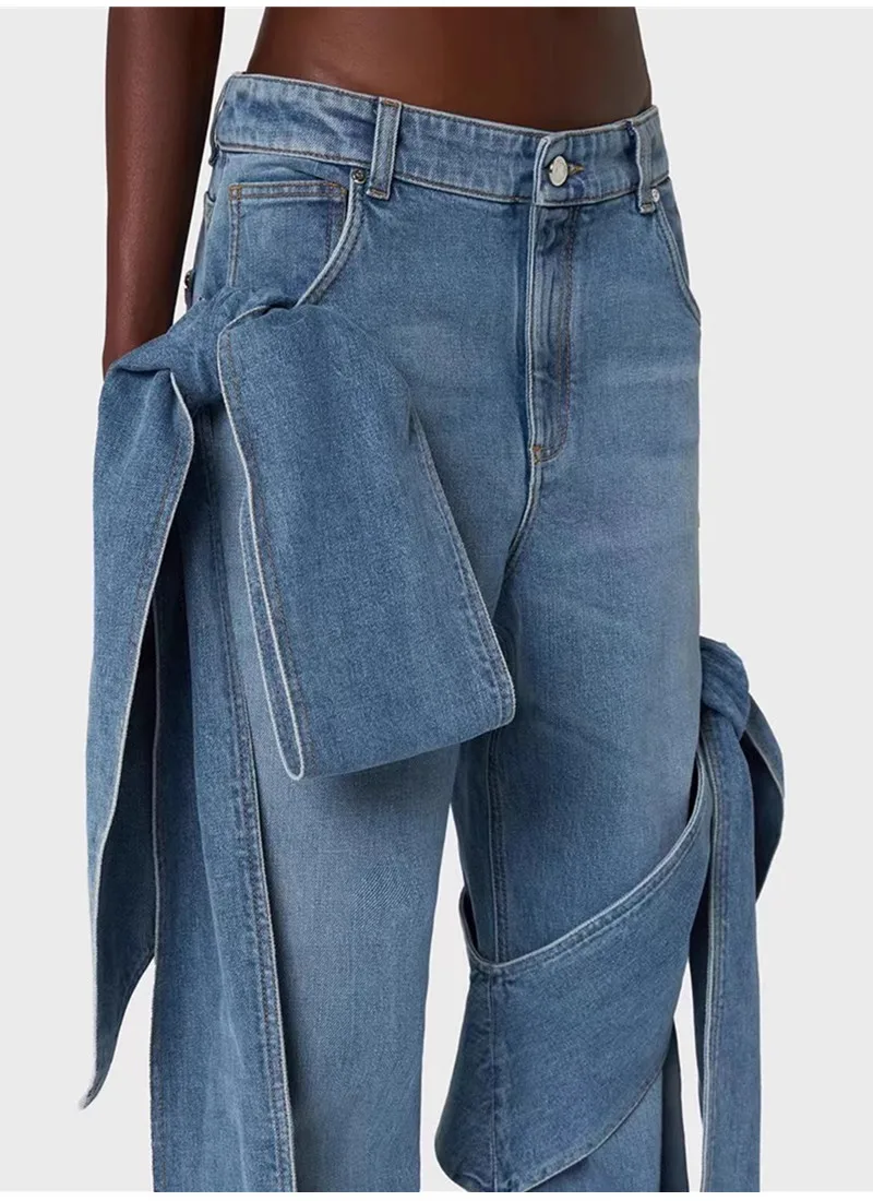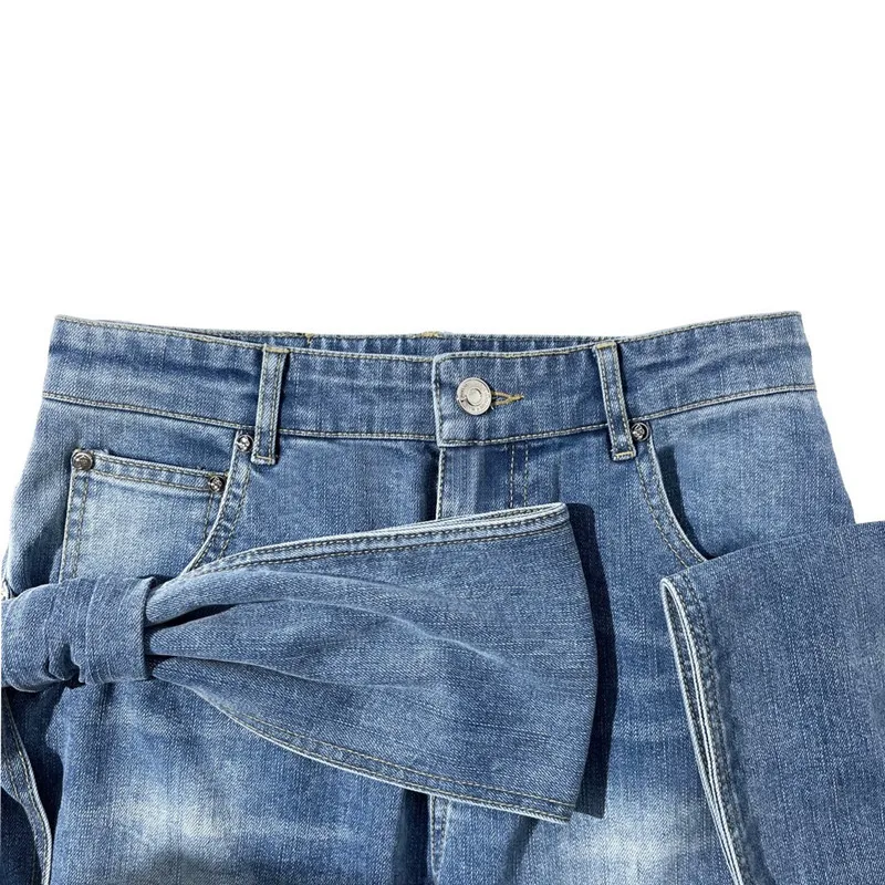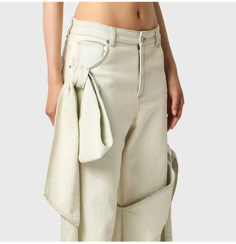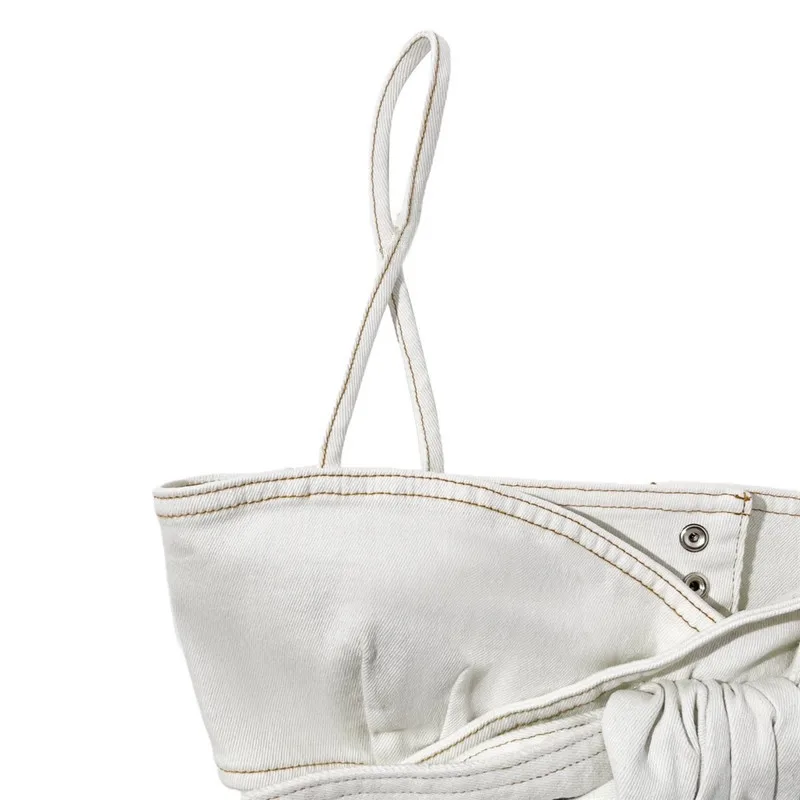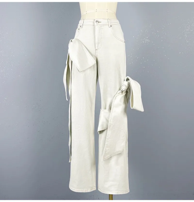 Fashion Women Bowtie Bandage 2 Piece set Denim crop tops Sling Vest High Waist Wide Leg Straight Janes Female Spring New Trendy